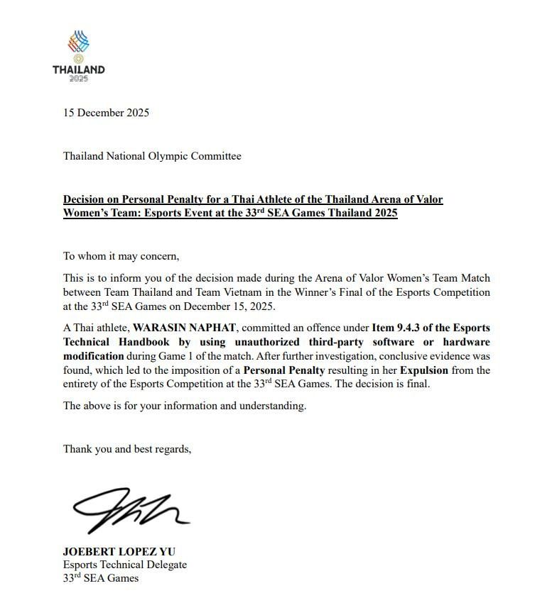 จากประเด็นที่ทางสมาคมกีฬาอีสปอร์ตแห่งประเทศไทย (TESF) ได้ออกประกาศคำสั่งลงโทษขั้นเด็ดขาด ขับนักแข่งสาวชื่อดัง “Tokyogurl” หรือ นางสาว ณภัทร วราสินธ์ ออกจากการแข่งขันทันที หลังถูกตรวจพบว่าทำผิดกฎร้ายแรง! ล่าสุด คุณสันติ โหลทอง นายกสมาคมกีฬาอีสปอร์ตแห่งประเทศไทยได้ออกมาประกาศถอนทีม RoV หญิง ทีมชาติไทย ออกจากการแข่งขันซีเกมส์ ครั้งที่ 33